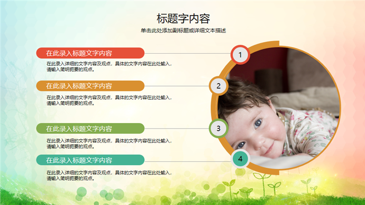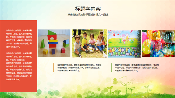 PPT简介: 活泼欢快儿童节主题幼儿教育家长会PPT模板是一款儿童节主题PPT模板,以彩色儿童活动剪影为封面,并将其封面元素和色调融合到内容页中,内容以目录为依据,结合各种不同形式的图文排版方式进行呈现,内容文本和插图均可自由编辑修改替换,配色清新柔和,通用于儿童节主题、幼儿教育、家长会等不同方面演示模板。本作品提供pptx格式文件下载,站长素材PPT大全提供精选的PPT模板素材。