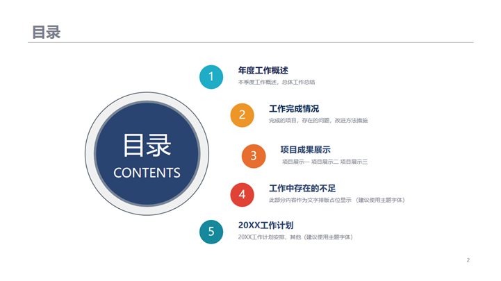 PPT简介: 公司企业年终总结商务汇报PPT模板是一款年终总结PPT模板,以藏蓝色背景和彩色艺术标题为封面,内容以目录为依据,涵盖年度概述、工作完成情况、项目成果展示、工作中存在的不足、新一年工作计划等方面,框架完整,内容详实,数据图表分析丰富,通用于各行业岗位年终总结、商务汇报等方面演示模板。本作品提供pptx格式文件下载,站长素材PPT大全提供精选的PPT模板素材。