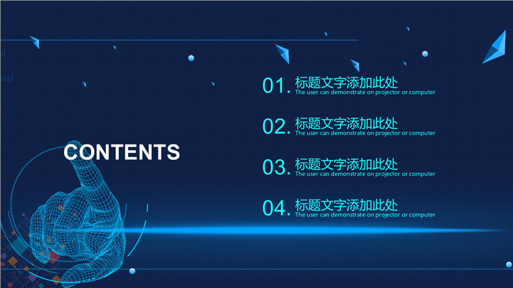 PPT简介: 蓝色科技云计算人工智能互联网通用PPT模板以科技蓝为模板基础色调,以几何元素和科技触控元素为封面,并将其元素融合于内容页中,内容以目录为依据,并结合各种数据图表进行阐述,框架完整,内容文本和插图可自由编辑修改,适用于云计算、人工智能、科技、互联网等领域演示模板。本作品提供pptx格式文件下载,站长素材PPT大全提供精选的PPT模板素材。