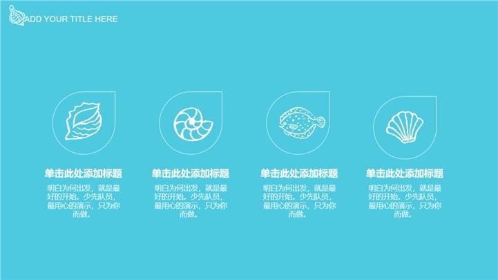 PPT简介: 蓝色清新海洋风创意通用PPT模板以蓝色为基础色调,并贯穿整套模板,以太阳、贝壳、云朵、音符、彩虹、气泡、遮阳伞等卡通元素为封面,内容以目录为依据,并结合各种不同的海洋风元素进行图文排版,整体风格清新简约,适用于各卡通清新场景等方面演示模板。本作品提供pptx格式文件下载,站长素材PPT大全提供精选的PPT模板素材。