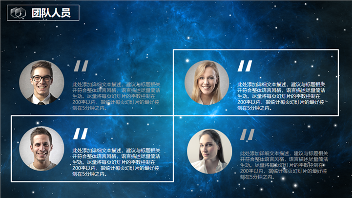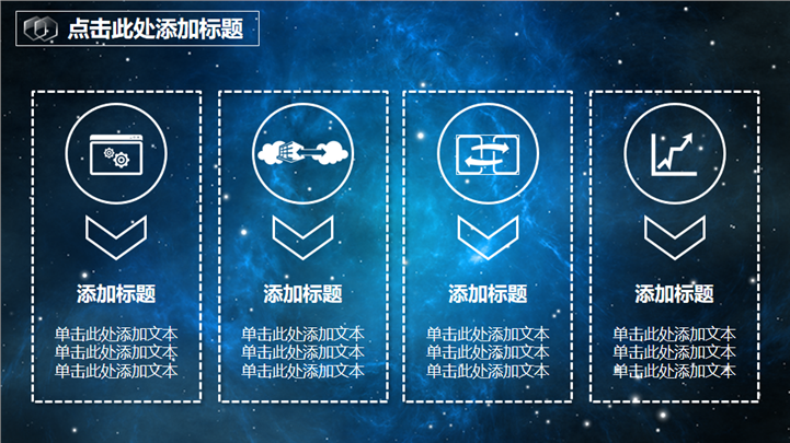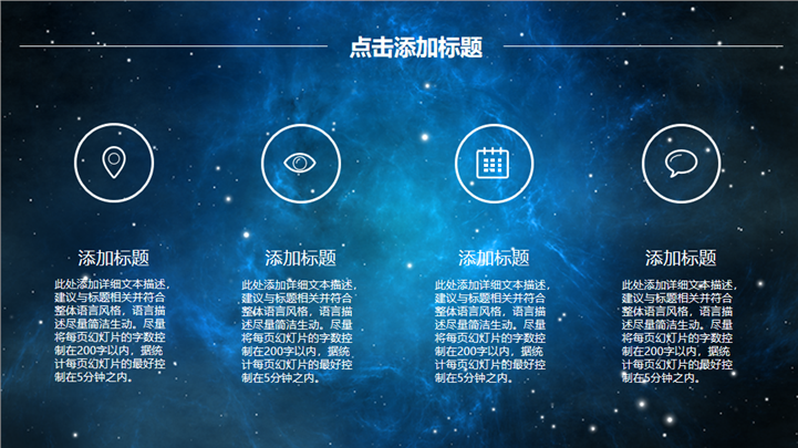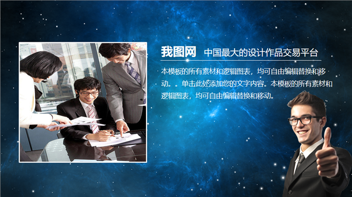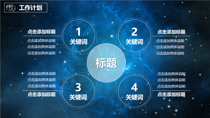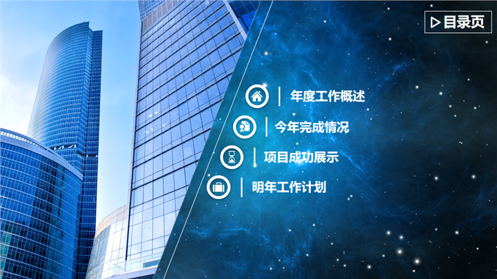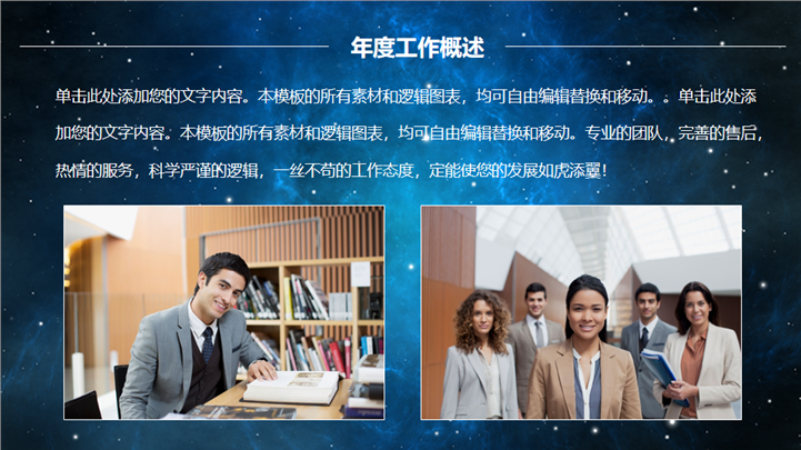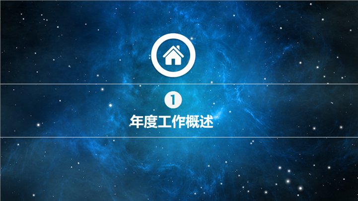 PPT简介: 蓝色星空风格框架完整总结计划报告PPT模板是一款总结计划报告PPT模板,以蓝色梦幻星空为模板底纹背景,并贯穿整套模板,内容以目录为依据,涵盖年度工作概述、今年完成情况、项目成功展示和明年工作计划等方面,并结合各种数据图表进行阐述,框架完整,内容文本和插图均可自由编辑修改,适用于各行业岗位工作总结计划报告等方面演示模板。本作品提供pptx格式文件下载,站长素材PPT大全提供精选的PPT模板素材。