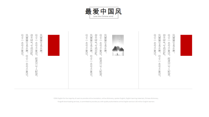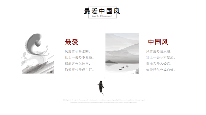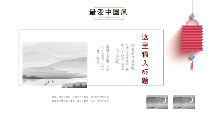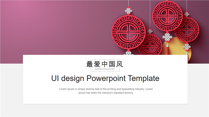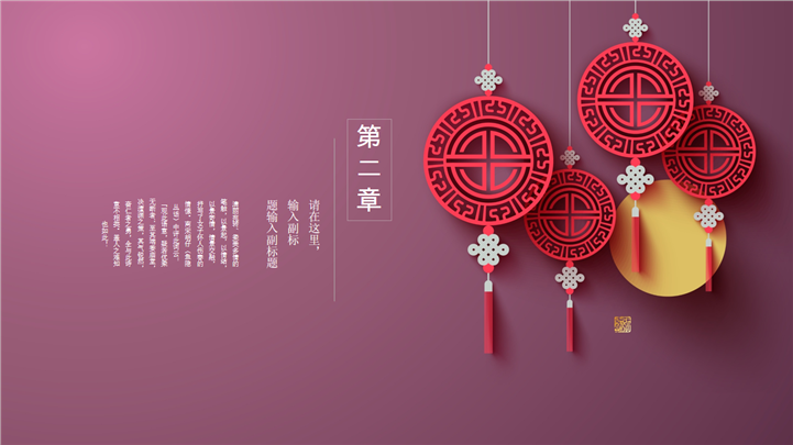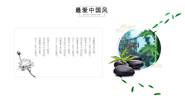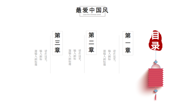 PPT简介: 最爱中国风主题通用PPT模板是一款中国风主题PPT模板,以中国扇、中国结、福字等元素为封面,内容包含灯笼、俄罗斯、竹叶、荷花、山水、锦鲤等中国风元素,内容以目录为依据,通过不同图文排版方式进行呈现,内容文本和插图元素均可自由编辑修改替换,整体风格前后保持一致,适用于各行业领域以中国风为主题的场景演示模板。本作品提供pptx格式文件下载,站长素材PPT大全提供精选的PPT模板素材。