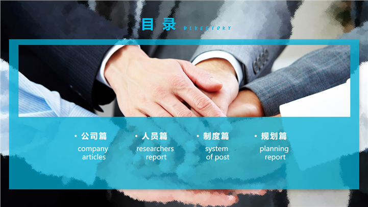 PPT简介: 公司介绍企业宣传入职培训PPT模板是以几何色块内嵌商务插图为封面,内容以目录为依据,涵盖公司篇、人员篇、制度篇和规划篇等方面,框架完整,内容详实,内容文本和插图均可自由编辑修改替换,配色柔和,风格简约商务,适用于各行业公司介绍、企业宣传、入职培训等方面演示模板。本作品提供pptx格式文件下载,站长素材PPT大全提供精选的PPT模板素材。