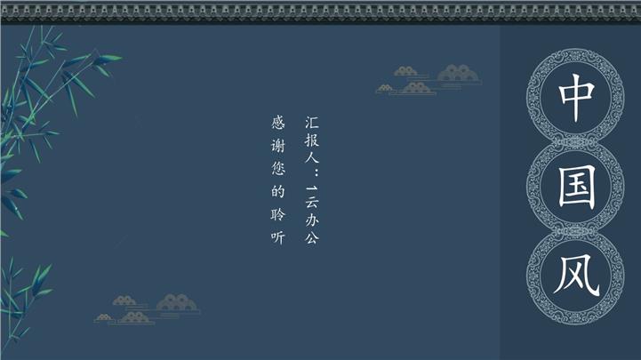 PPT简介: 极简古典中式简约周工作汇报ppt模板,暗蓝色为主色调,整体界面古典中式简约风格,适用于周工作汇报、周工作总结、计划总结、商务总结、工作总结、总结汇报、商务汇报等相关主题设计应用。主体文字及图片可替换修改,文字修改均可直接点击文本框进行编辑,图片更改可选中图片后单击鼠标右键插入更换图片,也可根据自身需求增加和删除。本作品提供PPT,PPTX格式文件,由【站长素材】原创,转载请注明出处!