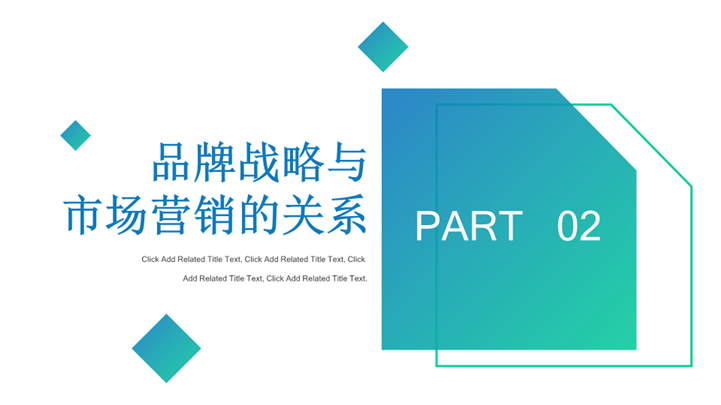 PPT简介: 企业品牌战略与市场营销ppt模板,蓝绿色渐变为主色调,整体界面大气商务风格,适用于市场营销、企业品牌营销、品牌战略、品牌战略、品牌营销、品牌推广等相关主题设计应用。主体文字及图片可替换修改,文字修改均可直接点击文本框进行编辑,图片更改可选中图片后单击鼠标右键插入更换图片,也可根据自身需求增加和删除。本作品提供PPT,PPTX格式文件,由【站长素材】原创,转载请注明出处!