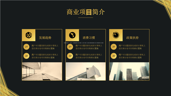 PPT简介: 黑金风商业项目投资进展汇报ppt模板,黑色、金色搭配为主,整体界面大气高端商务风格,主要包含公司团队介绍、商业项目简介、产品和运营、项目发展计划、财务和融资等模块内容,适用于银行、金融机构、投资理财、金融投资、商务投资、商务汇报等相关主题设计应用。主体文字及图片可替换修改,文字修改均可直接点击文本框进行编辑,图片更改可选中图片后单击鼠标右键插入更换图片,也可根据自身需求增加和删除。本作品提供PPTX格式文件,转载请注明出处!