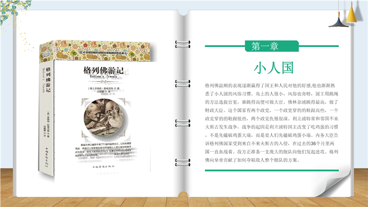 PPT简介: 《格列佛游记》读书分享ppt课件,整体界面简约风格,主要包含作者简介、主要内容、艺术特色等模块内容,适用于读书感悟、名著导读、读书分享会、阅读分享、读书心得、教育培训课件、课程开发、讲师培训、学校教育等相关主题设计应用。主体文字及图片可替换修改,文字修改均可直接点击文本框进行编辑,图片更改可选中图片后单击鼠标右键插入更换图片,也可根据自身需求增加和删除。本作品提供PPTX格式文件,转载请注明出处!