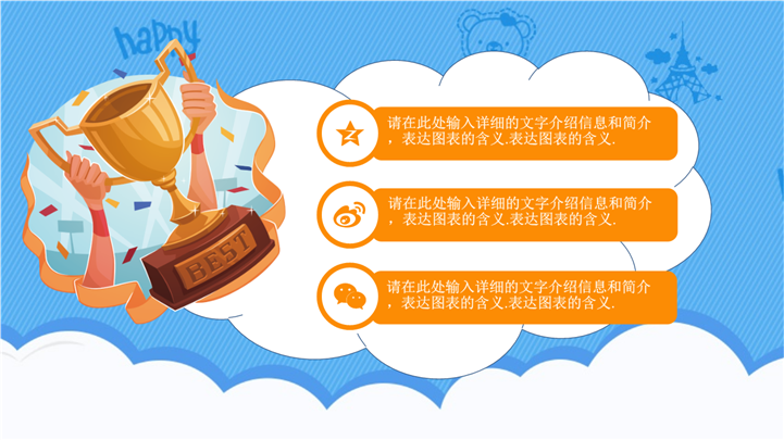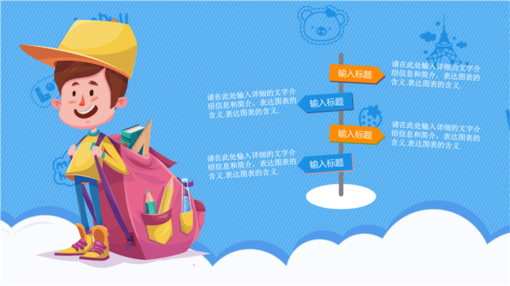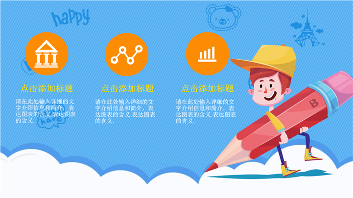 PPT简介: 蓝色卡通风读书分享会ppt模板,蓝色为主色调,整体界面可爱卡通风格,主要包含书名分享、心的分享、周边推荐、读书计划等模块内容,适用于读书感悟、名著导读、读书分享会、阅读分享、读书心得、教育培训课件、课程开发、讲师培训、学校教育等相关主题设计应用。主体文字及图片可替换修改,文字修改均可直接点击文本框进行编辑,图片更改可选中图片后单击鼠标右键插入更换图片,也可根据自身需求增加和删除。本作品提供PPTX格式文件,转载请注明出处!