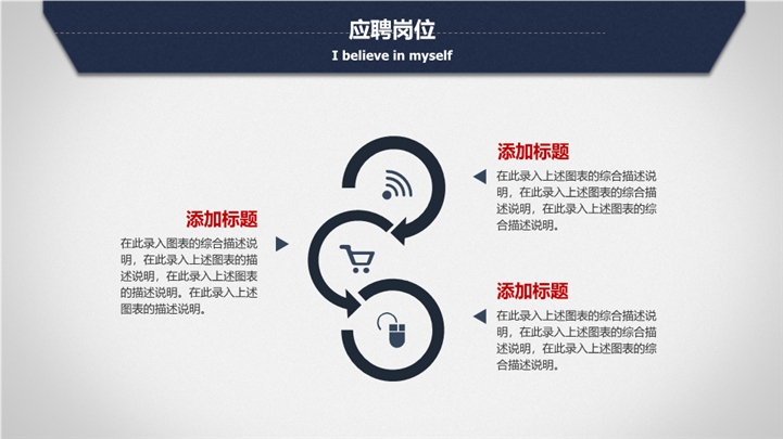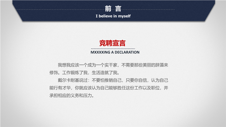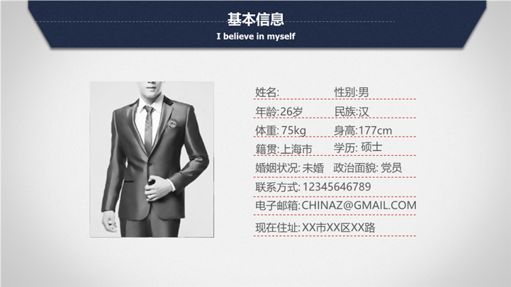 PPT简介: 创意个性简历求职竞聘框架完整ppt模板,藏青色为主色调,整体界面创意极简风格,主要包含基本资料 BASIC INFORMATION、岗位认知POST COGNITIVE、胜任能力COMPETENCE、目标规划OBJECT PROGRAM等模块内容,适用于岗位竞聘、求职竞聘、个人履历、职场规划、述职报告、自我介绍、个人简介、个人简历等相关主题设计应用。主体文字及图片可替换修改,文字修改均可直接点击文本框进行编辑,图片更改可选中图片后单击鼠标右键插入更换图片,也可根据自身需求增加和删除。本作品提供PPTX格式文件,转载请注明出处!