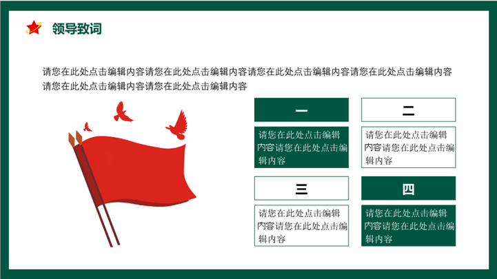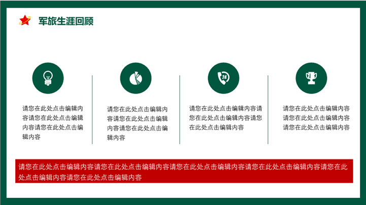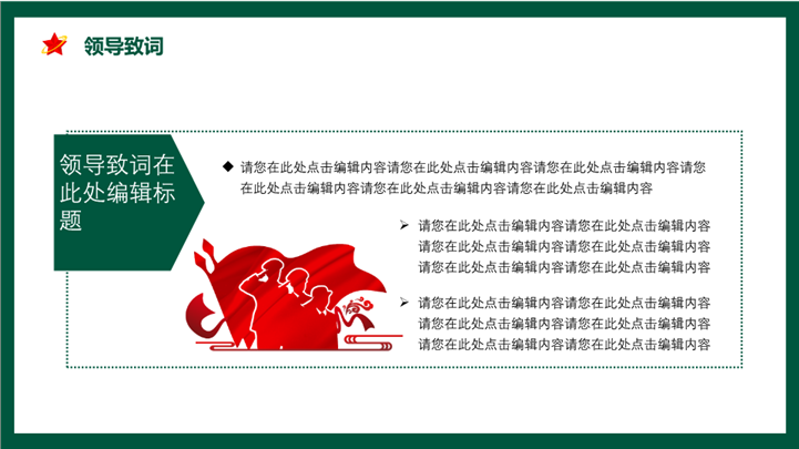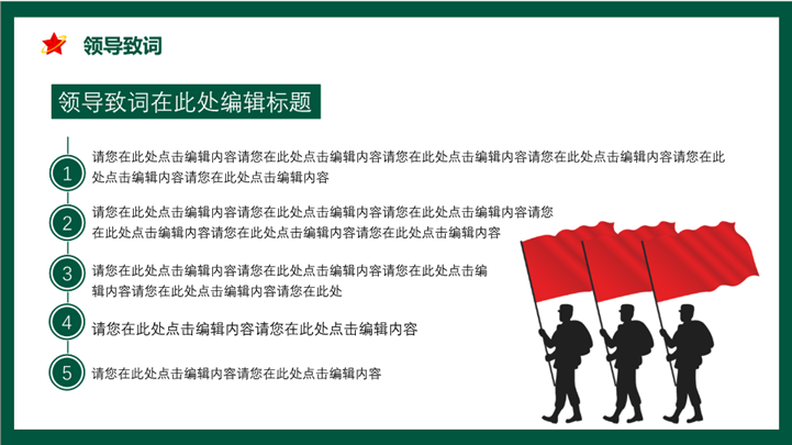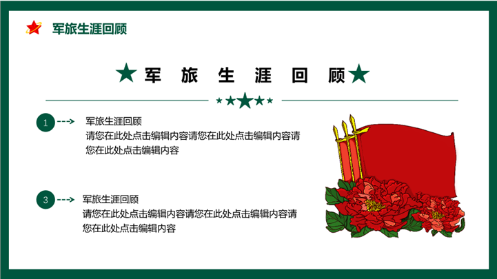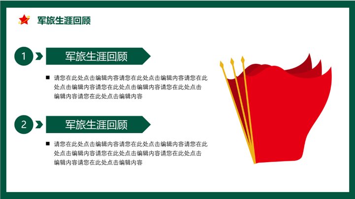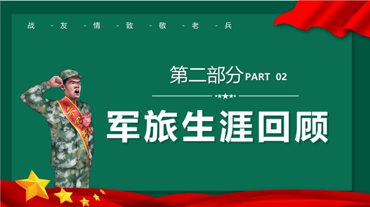 PPT简介: 战友情致敬老兵退休欢送会ppt模板,绿色、红色撞色搭配为主,整体界面党卡通政风格,主要包含领导致词、军旅生涯回顾、军旗告别仪式、代表发言、文艺晚会等模块内容,适用于战友聚会、部队、军队、友情、退伍、老兵、欢送会、战友聚会、战友情、部队退伍等相关主题设计应用。主体文字及图片可替换修改,文字修改均可直接点击文本框进行编辑,图片更改可选中图片后单击鼠标右键插入更换图片,也可根据自身需求增加和删除。本作品提供PPTX格式文件,转载请注明出处!
