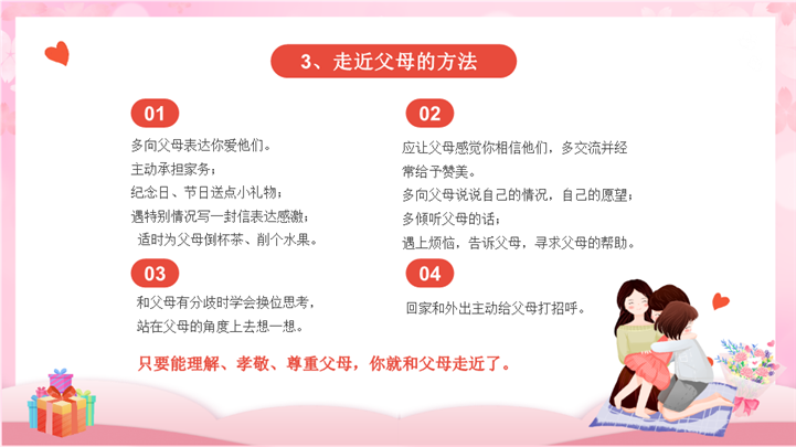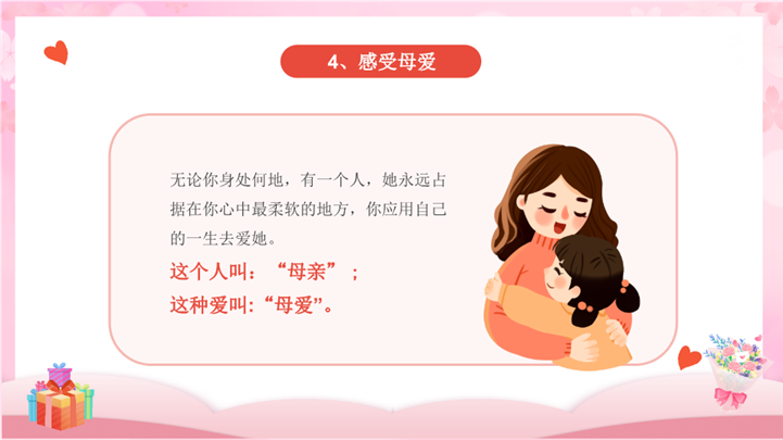 PPT简介: 粉色可爱感恩励志教育主题班会ppt模板,粉色为主色调,整体界面可爱卡通风格,主要包含感恩父、感恩老师、感恩朋友、感恩社会/感恩生活、树立目标 励志奋进等模块内容,适用于感恩节、中小学班会、感恩主题班会、主题班会、学校教育、感恩父母、感恩老师、感恩社会、感恩生活、感恩的心等相关主题设计应用。主体文字及图片可替换修改,文字修改均可直接点击文本框进行编辑,图片更改可选中图片后单击鼠标右键插入更换图片,也可根据自身需求增加和删除。本作品提供PPTX格式文件,转载请注明出处!