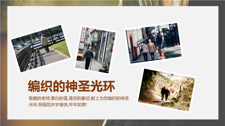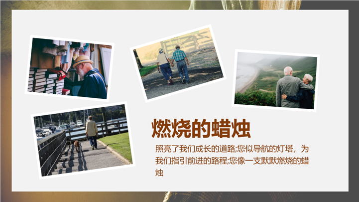 PPT简介: 怀旧风教师职工退休欢送会ppt模板,棕色为主色调,整体界面怀旧风格,以照片排版为主,主要包含铭刻在我心里、编织的神圣光环、知识的土壤、老师、燃烧的蜡烛、时光已悄然过去、桃李满天下、虔诚得不敢寻觅词汇等模块内容,适用于教师退休、教师职工退休环水、退休欢送会、光荣退休、老师退休等相关主题设计应用。主体文字及图片可替换修改,文字修改均可直接点击文本框进行编辑,图片更改可选中图片后单击鼠标右键插入更换图片,也可根据自身需求增加和删除。本作品提供PPTX格式文件,转载请注明出处!