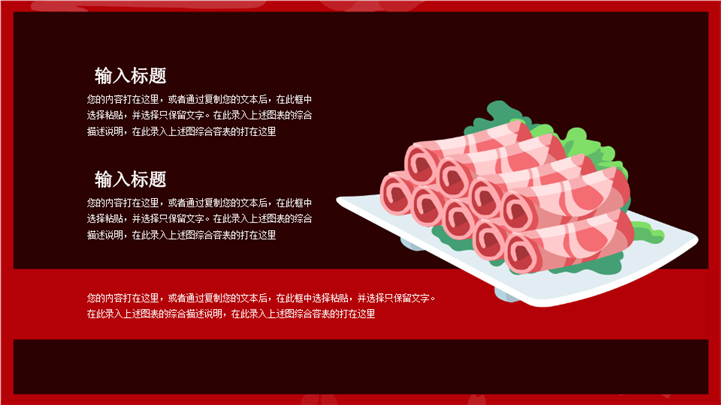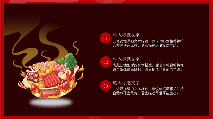 PPT简介: 老火锅餐饮项目营销策划ppt模板,还是为主色调,整体界面中式美食风格,适用于餐饮营销、火锅营销、没事营销、美食营销策划、餐饮美食营销、中式美食营销等相关主题设计应用。主体文字及图片可替换修改,文字修改均可直接点击文本框进行编辑,图片更改可选中图片后单击鼠标右键插入更换图片,也可根据自身需求增加和删除。本作品提供PPTX格式文件,转载请注明出处!