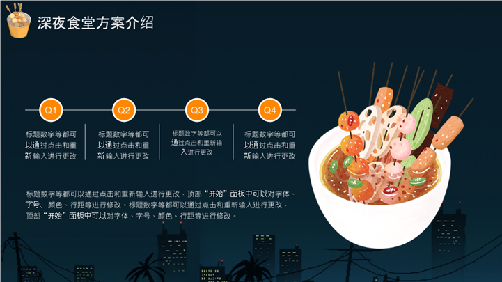 PPT简介: 深夜美食深夜食堂经营方案介绍ppt模板,深色为主色调,主要包含深夜食堂方案介绍、夜经济生态说明、夜经济大数据分析、经营试点展示等模块内容,适用于深夜美食、深夜食堂、美食经营、美食简约方案、美食营销、美食宣传等相关主题设计应用。主体文字及图片可替换修改,文字修改均可直接点击文本框进行编辑,图片更改可选中图片后单击鼠标右键插入更换图片,也可根据自身需求增加和删除。本作品提供PPTX格式文件,转载请注明出处!