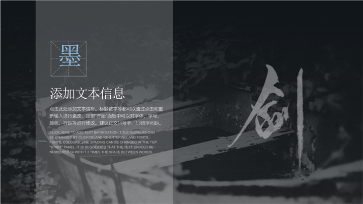 PPT简介: 墨影风古风古代文人情怀韵味ppt模板,墨色为主色调,整体界面中式古典风格,适用于计划总结、商务总结、工作总结、总结汇报、商务汇报等相关主题设计应用。主体文字及图片可替换修改,文字修改均可直接点击文本框进行编辑,图片更改可选中图片后单击鼠标右键插入更换图片,也可根据自身需求增加和删除。本作品提供PPTX格式文件,转载请注明出处!