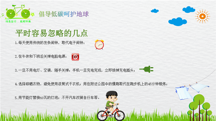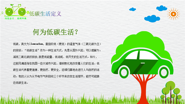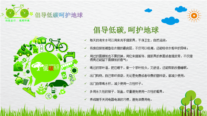 PPT简介: 低碳生活远离污染环境保护ppt模板,绿色为主色调,整体界面可爱卡通风格,主要包含低碳生活定义、倡导低碳 呵护地球、低碳生活 从我做起等模块内容,适用于计保护环境、垃圾分类、环保宣讲、爱护环境、绿色环保、环境保护、环保宣教、绿色环境、低碳生活、节能宣传、节能减排、环保主题班会等相关主题设计应用。主体文字及图片可替换修改,文字修改均可直接点击文本框进行编辑,图片更改可选中图片后单击鼠标右键插入更换图片,也可根据自身需求增加和删除。本作品提供PPTX格式文件,转载请注明出处!