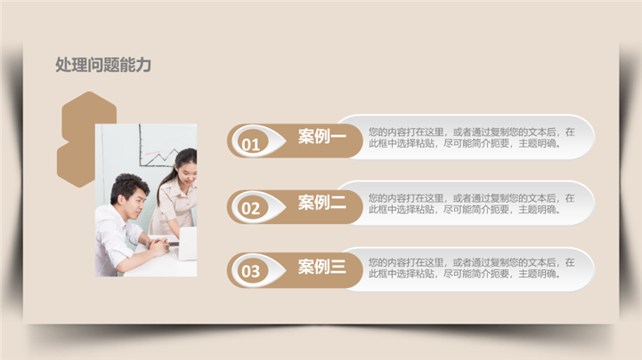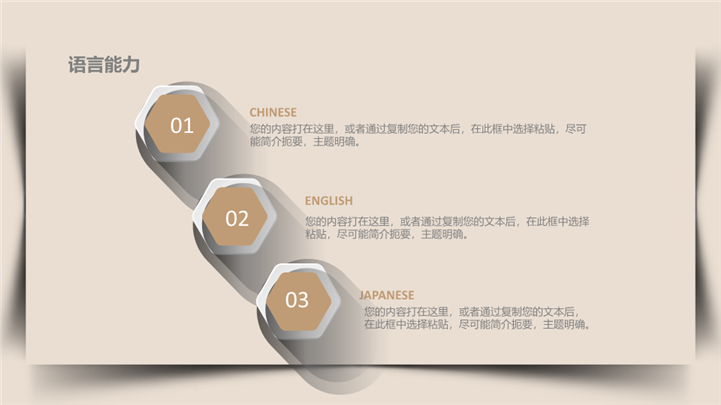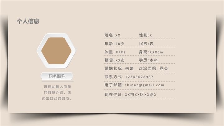 PPT简介: 微立体研究生复试个人简历ppt模板,卡其色为主色调,整体界面简洁创意风格,主要包含基本信息、专业认知、专业能力、未来规划等模块内容,适用于自我介绍、个人简历、研究生面试、研究生复试、研究生面试、考研复试、研究生复试、考研面试、研究生考研等相关主题设计应用。主体文字及图片可替换修改,文字修改均可直接点击文本框进行编辑,图片更改可选中图片后单击鼠标右键插入更换图片,也可根据自身需求增加和删除。本作品提供PPTX格式文件,转载请注明出处!