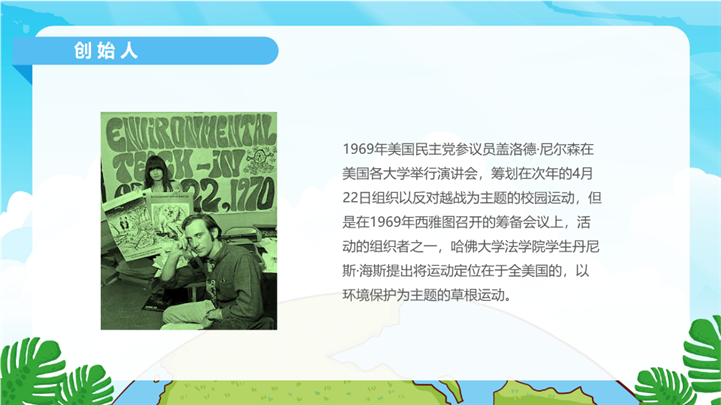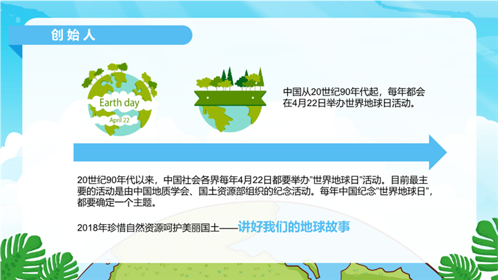 PPT简介: 绿色清新世界地球日主题ppt模板,蓝绿色搭配为主,整体界面可爱卡通风格,主要包含世界地球日简介、世界地球日活动影响、世界地球日环境问题、守护地球的故事等模块内容,适用于环保宣传、环保教育活动、地球日相关的公益活动或校园活动策划、环保教育课件、世界地球日、世界地球日班会等相关主题设计应用。主体文字及图片可替换修改,文字修改均可直接点击文本框进行编辑,图片更改可选中图片后单击鼠标右键插入更换图片,也可根据自身需求增加和删除。本作品提供PPTX格式文件,转载请注明出处!