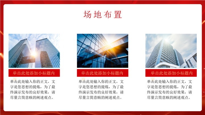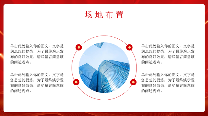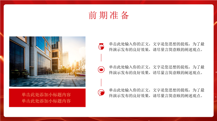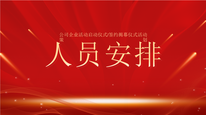 PPT简介: 公司企业活动启动签约揭幕仪式活动策划ppt模板,红色为主色调,整体界面大气喜庆风格,主要包含前期准备、场地布置、人员安排、结束语等模块内容,适用于企业活动庆典、企业启动仪式、签约仪式、揭幕仪式、企业活动策划等相关主题设计应用。主体文字及图片可替换修改,文字修改均可直接点击文本框进行编辑,图片更改可选中图片后单击鼠标右键插入更换图片,也可根据自身需求增加和删除。本作品提供PPTX格式文件,转载请注明出处!