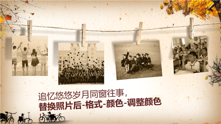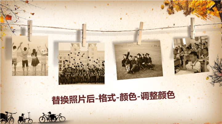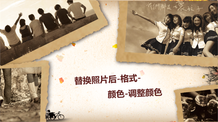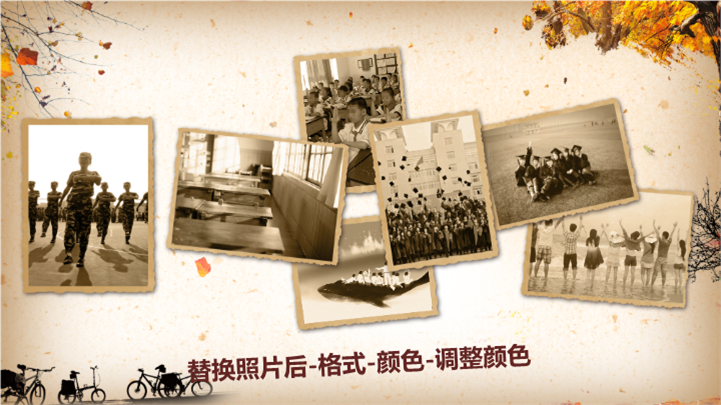 PPT简介: 珍藏每一刻毕业时刻毕业相册ppt模板,米黄色为主色调,整体界面怀旧复古风格,适用于初曾相识、校园风采、青春追梦、离别赠言、毕业典礼、同学聚会、学校活动、青春主题的演讲或讲座等相关主题设计应用。主体文字及图片可替换修改,文字修改均可直接点击文本框进行编辑,图片更改可选中图片后单击鼠标右键插入更换图片,也可根据自身需求增加和删除。本作品提供PPTX格式文件,转载请注明出处!