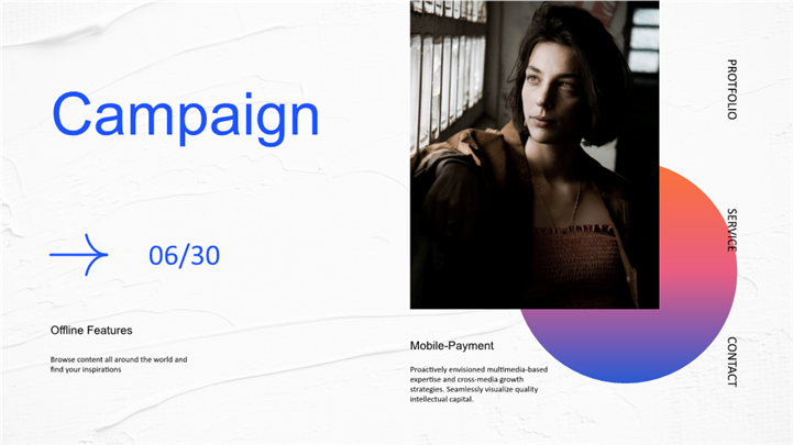 PPT简介: 时尚潮流质感宣传画册ppt模板,整体界面时尚潮流风格,适用于互联网运营、媒体运营、运营推广方案产品揭幕与介绍、市场分析与定位、企业产品宣传、产品介绍、产品展示、产品宣传、产品发布会等相关主题设计应用。主体文字及图片可替换修改,文字修改均可直接点击文本框进行编辑,图片更改可选中图片后单击鼠标右键插入更换图片,也可根据自身需求增加和删除。本作品提供PPTX格式文件,转载请注明出处!