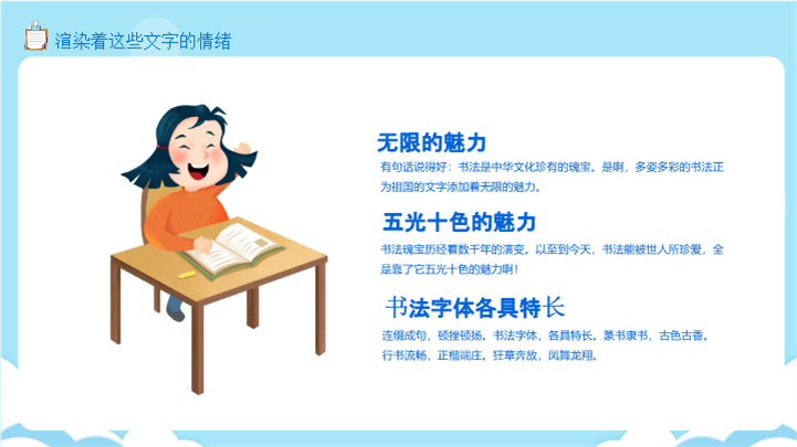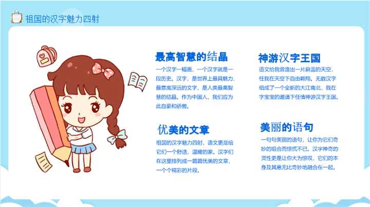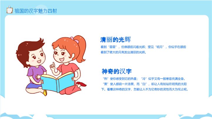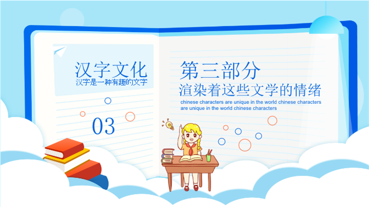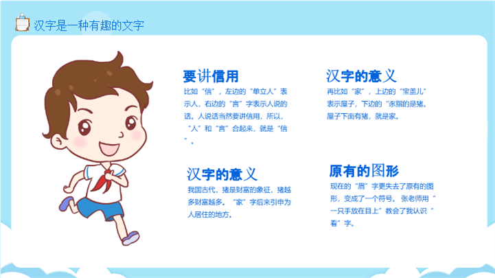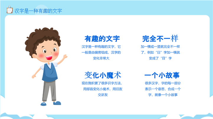 PPT简介: 蓝色卡通有趣的汉字教学课件ppt模板,蓝色为主色调,整体界面可爱卡通风格,主要包含汉字是一种有趣的文字、祖国的汉字魅力四射、渲染着这些文字的情绪、汉字书法是一门独特的艺术等模块内容,适用于教学分析、教学设计、教学说课、教学方案、公开课、教师公开课、公开课课件、教师工作总结等相关主题设计应用。主体文字及图片可替换修改,文字修改均可直接点击文本框进行编辑,图片更改可选中图片后单击鼠标右键插入更换图片,也可根据自身需求增加和删除。本作品提供PPTX格式文件,转载请注明出处!