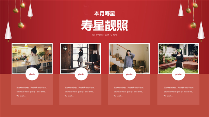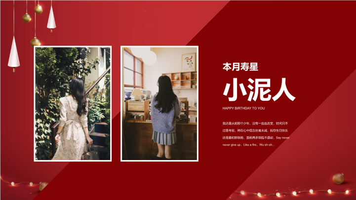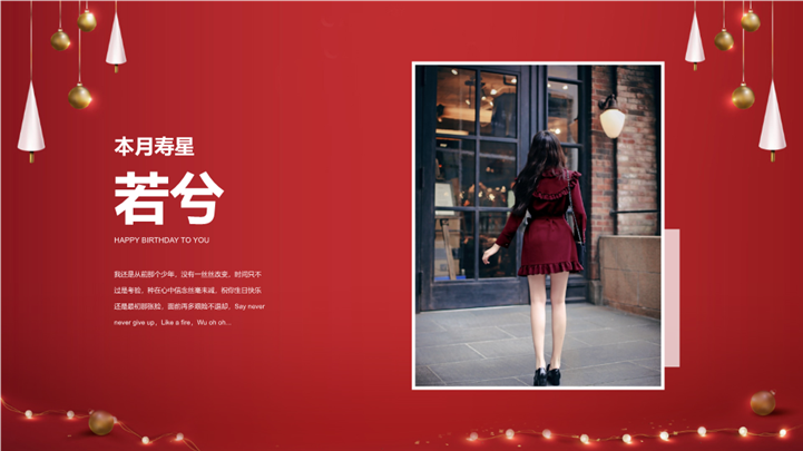 PPT简介: 红色背景企业员工生日快乐生日会策划ppt模板,红色为主色调,整体界面简洁大方风格,适用于生日会、企业生日会、生日会庆祝、祝你生日快乐、员工生日会、企业员工生日会、生日活动策划等相关主题设计应用。主体文字及图片可替换修改,文字修改均可直接点击文本框进行编辑,图片更改可选中图片后单击鼠标右键插入更换图片,也可根据自身需求增加和删除。本作品提供PPTX格式文件,转载请注明出处!