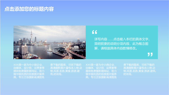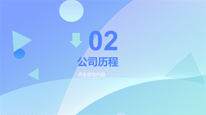 PPT简介: 蓝紫色渐变企业风采企业宣传ppt模板,蓝紫色渐变为主色调,整体界面简洁商务风格,主要包含公司概述、公司历程、公司团队、公司业务等模块内容,适用于企业文化建设、价值观传、企业发展、公司简介、公司介绍、企业介绍、企业宣传、产品介绍、产品宣传等相关主题设计应用。主体文字及图片可替换修改,文字修改均可直接点击文本框进行编辑,图片更改可选中图片后单击鼠标右键插入更换图片,也可根据自身需求增加和删除。本作品提供PPTX格式文件,转载请注明出处!