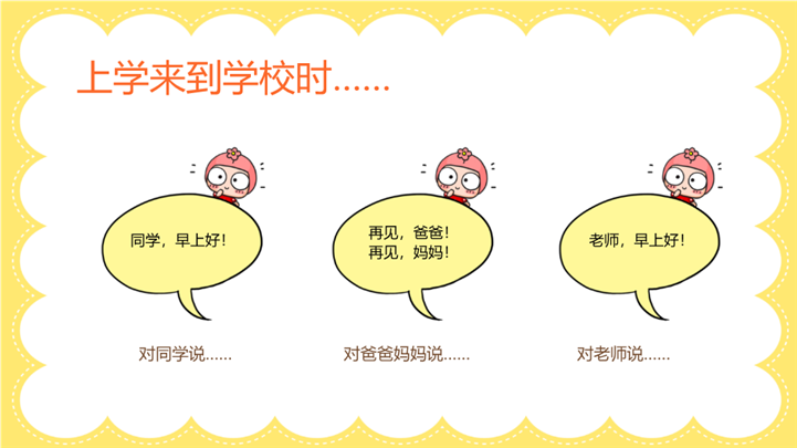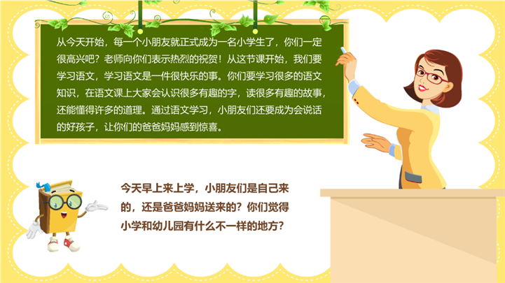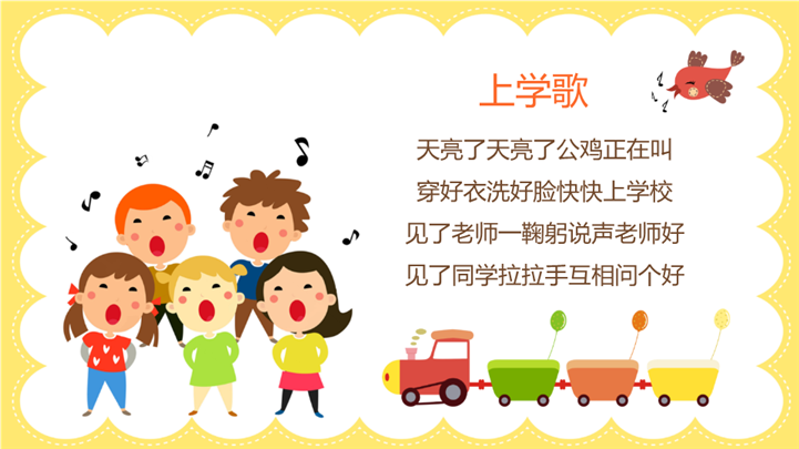 PPT简介: 可爱卡通一年级迎新主题班会ppt模板,彩色为主色调,整体界面可爱卡通风格,主要包含学前小知识、 学习方法、 如何相处、儿歌学习等模块内容,适用于开学家长会、新学期家长会、主题班会、家长会、新生自我介绍、小学生自我介绍、兴趣爱好展示、开学自我介绍、迎新会自我介绍、班级破冰活动、等相关主题设计应用。主体文字及图片可替换修改,文字修改均可直接点击文本框进行编辑,图片更改可选中图片后单击鼠标右键插入更换图片,也可根据自身需求增加和删除。本作品提供PPTX格式文件,转载请注明出处!