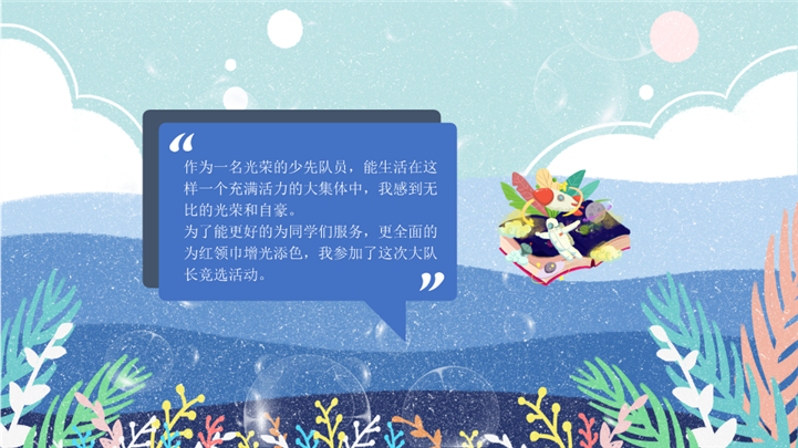 PPT简介: 水彩风小学生班干部竞选自我介绍ppt模板,蓝紫色为主色调,整体界面水彩风风格,主要包含我的爱好、我的兴趣、我的生活等模块内容,适用于小学生竞选、新学期竞选、班干部竞选、学生竞选、竞选自我介绍、班干部个人自我介绍等相关主题设计应用。主体文字及图片可替换修改,文字修改均可直接点击文本框进行编辑,图片更改可选中图片后单击鼠标右键插入更换图片,也可根据自身需求增加和删除。本作品提供PPTX格式文件,转载请注明出处!