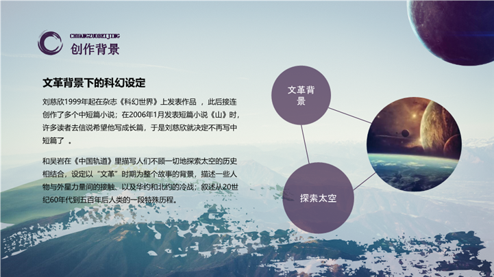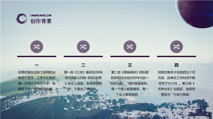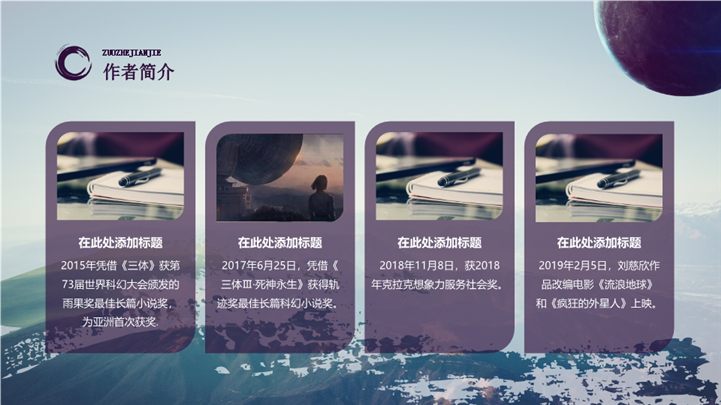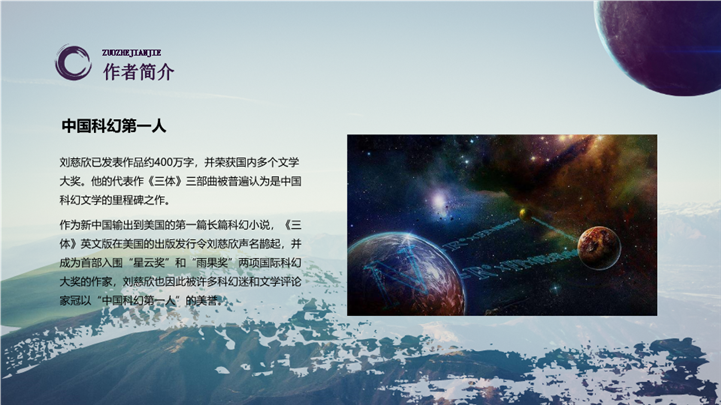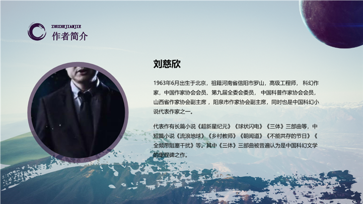 PPT简介: 国内名著《三体》读书笔记ppt模板,蓝色为主色调,整体界面简洁大方风格,主要包含作者简介、创作背景、内容介绍、人物关系、作品鉴赏等模块内容,适用于读书感悟、名著导读、读书分享会、阅读分享、读书心得、教育培训课件、课程开发、讲师培训、学校教育等相关主题设计应用。主体文字及图片可替换修改,文字修改均可直接点击文本框进行编辑,图片更改可选中图片后单击鼠标右键插入更换图片,也可根据自身需求增加和删除。本作品提供PPTX格式文件,转载请注明出处!