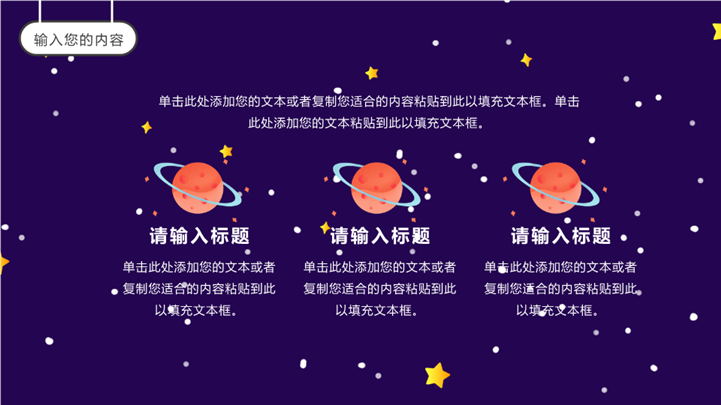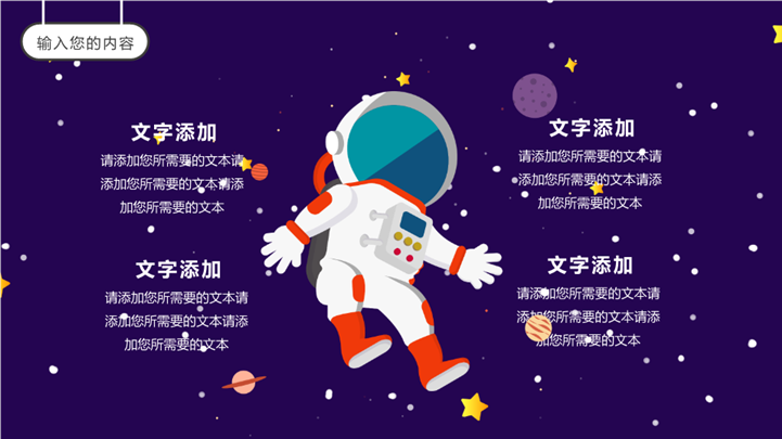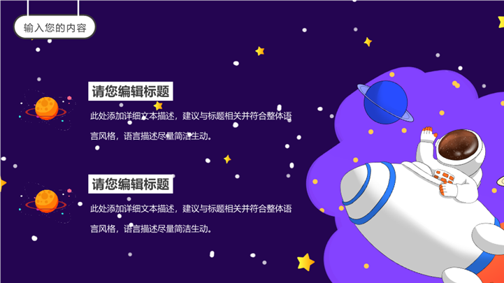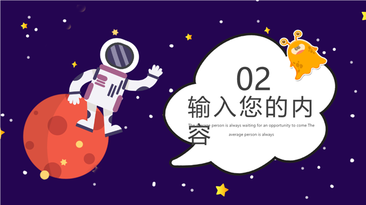 PPT简介: 卡通航空宇宙主题家长会通用ppt模板,紫色为主色调,整体界面卡通风格,适用于工期中家长会、期中考试分析、成绩分析班会、开学第一课、开学家长会、新学期家长会、主题班会、家长会、学校教育、家校共携、家校携手共育、家校共育、交流活动、学校活动等相关主题设计应用。主体文字及图片可替换修改,文字修改均可直接点击文本框进行编辑,图片更改可选中图片后单击鼠标右键插入更换图片,也可根据自身需求增加和删除。本作品提供PPTX格式文件,转载请注明出处!