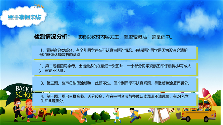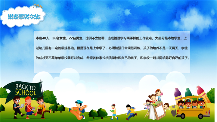 PPT简介: 卡通小学生班级期中家长会ppt模板,蓝色绿色为主色调,整体界面卡通风格,主要包含期中考试分析、班级情况分析、关于作息时间、课程表的调整、在校存在的一些问题、给家长的一些建议、培养孩子良好的学习习惯等模块内容,适用于家长会、小学家长会、下学期家长会、期中家长会、期中考试分析、主题班会、家长会、学校教育、家校共携、家校携手共育、家校共育、交流活动、学校活动等相关主题设计应用。主体文字及图片可替换修改,文字修改均可直接点击文本框进行编辑,图片更改可选中图片后单击鼠标右键插入更换图片,也可根据自身需求增加和删除。本作品提供PPTX格式文件,转载请注明出处!