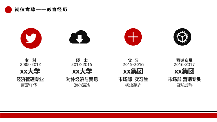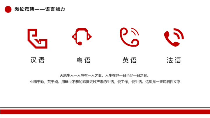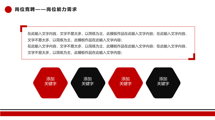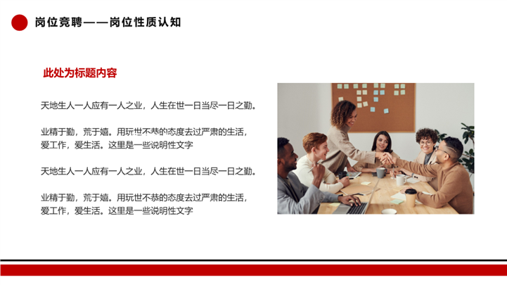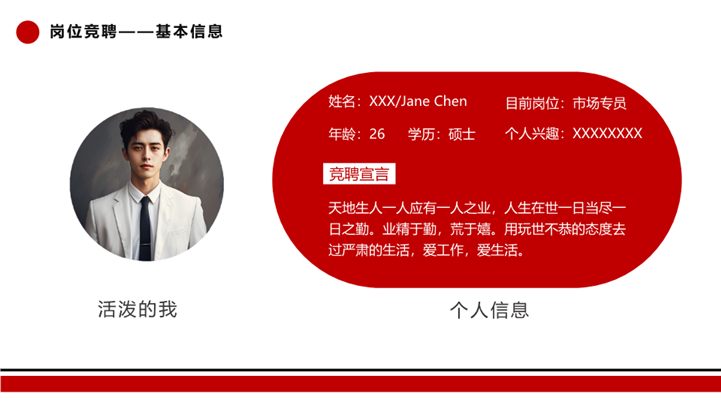 PPT简介: 红色大气竞聘演讲述职报告ppt模板,红色为主色调,整体界面简洁商务风格,主要包含个人简介、岗位认知、胜任能力、未来规划等模块内容,适用于商务述职、岗位竞聘、求职竞聘、个人履历、职场规划、述职报告等相关主题设计应用。主体文字及图片可替换修改,文字修改均可直接点击文本框进行编辑,图片更改可选中图片后单击鼠标右键插入更换图片,也可根据自身需求增加和删除。本作品提供PPTX格式文件,转载请注明出处!