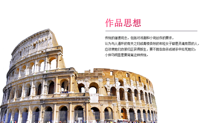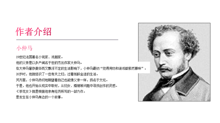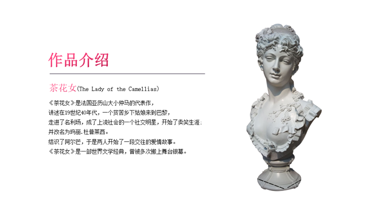 PPT简介: 《茶花女》国外名著读书笔记ppt模板,整体界面简洁大方风格,主要包含作者介绍、作品分析、人物介绍、心得感悟等模块内容,适用于读书感悟、名著导读、读书分享会、阅读分享、读书心得、教育培训课件、课程开发、讲师培训、学校教育等相关主题设计应用。主体文字及图片可替换修改,文字修改均可直接点击文本框进行编辑,图片更改可选中图片后单击鼠标右键插入更换图片,也可根据自身需求增加和删除。本作品提供PPTX格式文件,转载请注明出处!