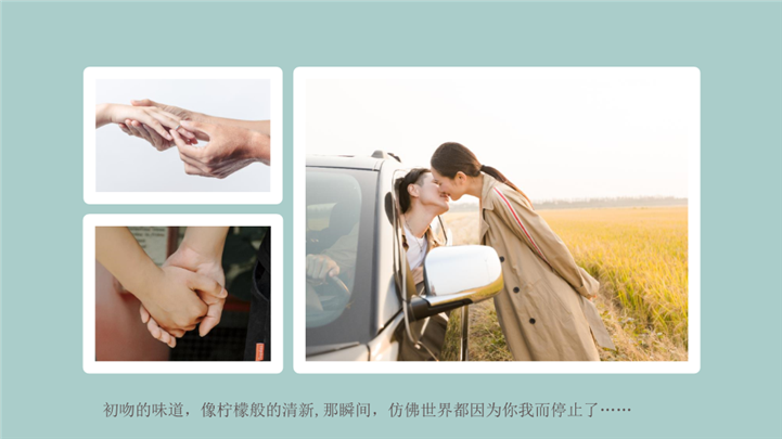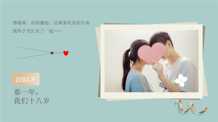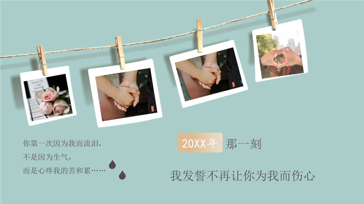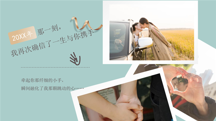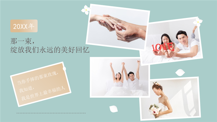 PPT简介: 浪漫温馨婚礼庆典婚礼策划ppt模板,浅绿色为主色调,整体界面浪漫风格,适用于情人节、求婚表白、浪漫告白、婚庆婚礼、时尚杂志、婚礼策划、婚庆、婚礼相册、婚礼记录、婚礼邀请函、婚礼画册等相关主题设计应用。主体文字及图片可替换修改,文字修改均可直接点击文本框进行编辑,图片更改可选中图片后单击鼠标右键插入更换图片,也可根据自身需求增加和删除。本作品提供PPTX格式文件,转载请注明出处!