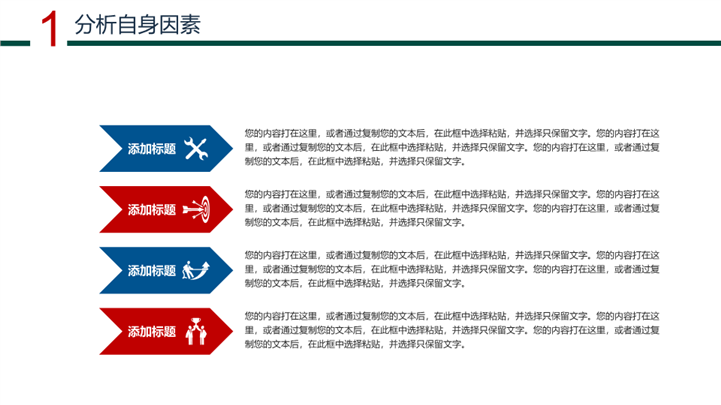 PPT简介: 简约红蓝撞色职业生涯规划书ppt模板,红蓝撞色为主色,整体界面简洁大方风格,主要包含分析自身因素、外在环境因素、职业生涯规划、如何执行计划等模块内容,适用于大学生规划、职业规划、职业生涯规划、职业生涯、职业规划培训、个人职业发展规划、职业成长指导、员工培训计划、绩效评估与反馈、职业转型指导、晋升路径规划、员工个人发展计划等相关主题设计应用。主体文字及图片可替换修改,文字修改均可直接点击文本框进行编辑,图片更改可选中图片后单击鼠标右键插入更换图片,也可根据自身需求增加和删除。本作品提供PPTX格式文件,转载请注明出处!