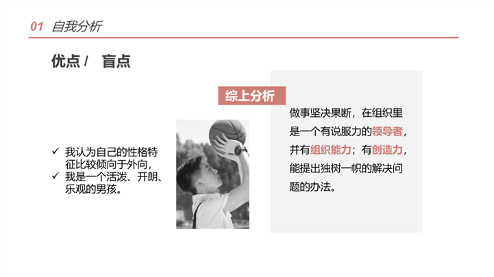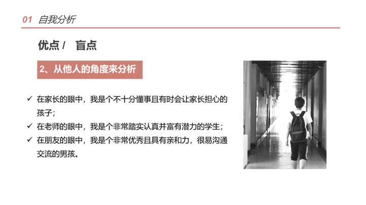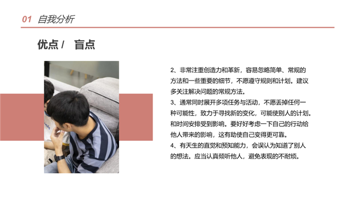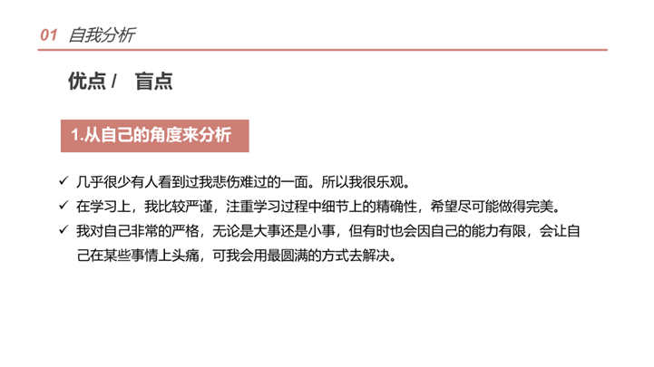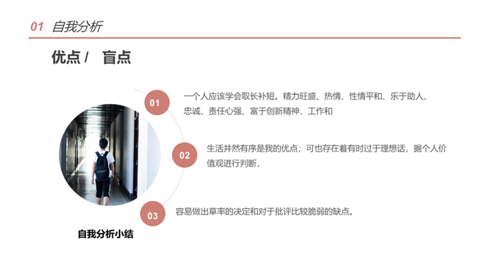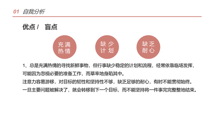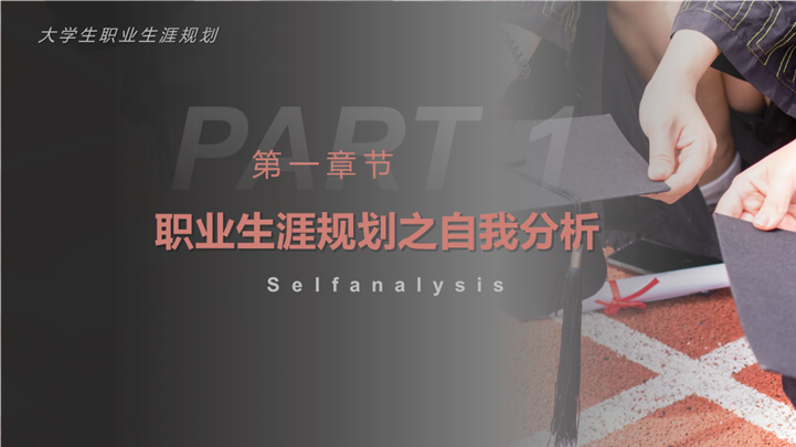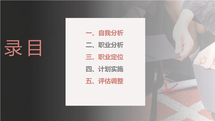 PPT简介: 简洁学术风大学生职业生涯规划ppt模板,橘粉色为主色调,整体界面简洁大方风格,主要包含自我分析、职业分析、职业定位、计划实施、评估调整等模块内容,适用于大学生规划、职业规划、职业生涯规划、职业生涯、职业规划培训、个人职业发展规划、职业成长指导等相关主题设计应用。主体文字及图片可替换修改,文字修改均可直接点击文本框进行编辑,图片更改可选中图片后单击鼠标右键插入更换图片,也可根据自身需求增加和删除。本作品提供PPTX格式文件,转载请注明出处!
