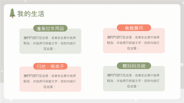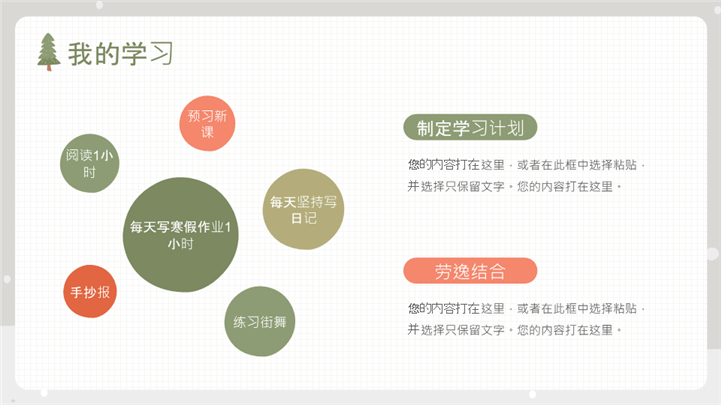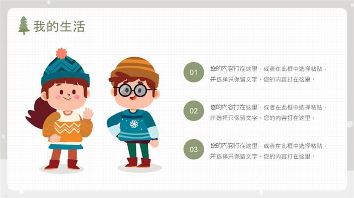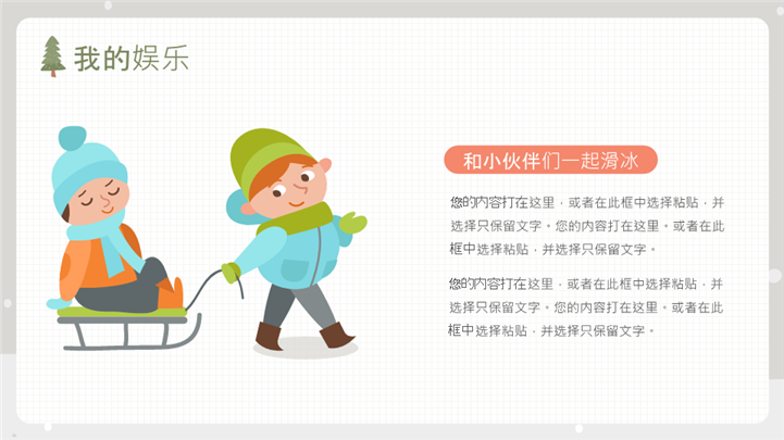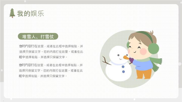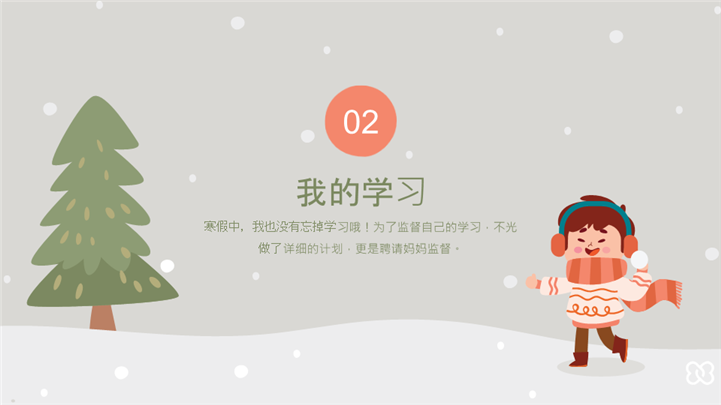 PPT简介: 小清新小学生我的快乐寒假时光ppt模板,淡绿色为主色调,整体界面卡通小清新风格,主要包含我的生活、我的学习、我的娱乐、我的总结等模块内容,适用于我的寒假生活、寒假生活、快乐寒假、寒假时光、寒假计划、寒假收获、精彩寒假等相关主题设计应用。主体文字及图片可替换修改,文字修改均可直接点击文本框进行编辑,图片更改可选中图片后单击鼠标右键插入更换图片,也可根据自身需求增加和删除。本作品提供PPTX格式文件,转载请注明出处!