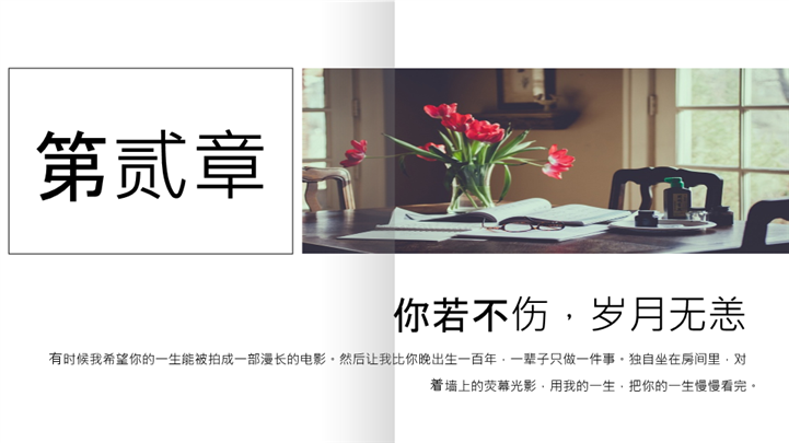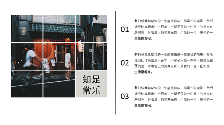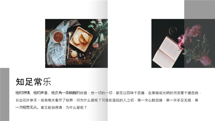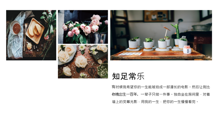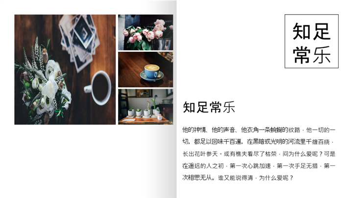 PPT简介: 知足常乐生活哲学记录分享ppt模板,棕色为主色调,整体界面简洁大方风格,适用于生活记录、生活态度、生活哲学、生活分享、价值观、世界观等相关主题设计应用。主体文字及图片可替换修改,文字修改均可直接点击文本框进行编辑,图片更改可选中图片后单击鼠标右键插入更换图片,也可根据自身需求增加和删除。本作品提供PPTX格式文件,转载请注明出处!