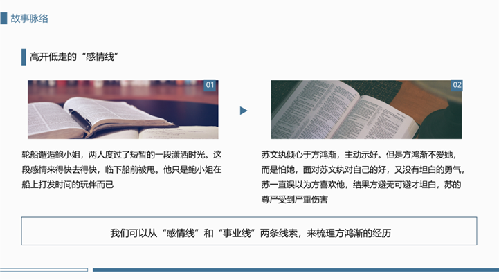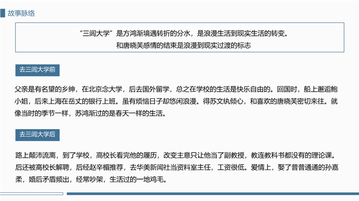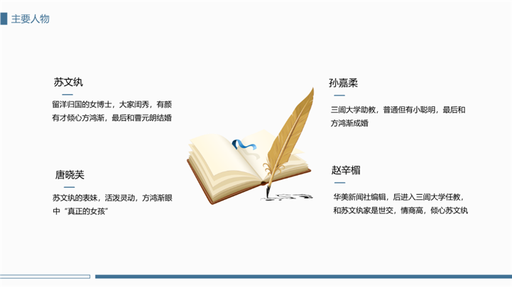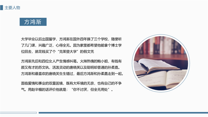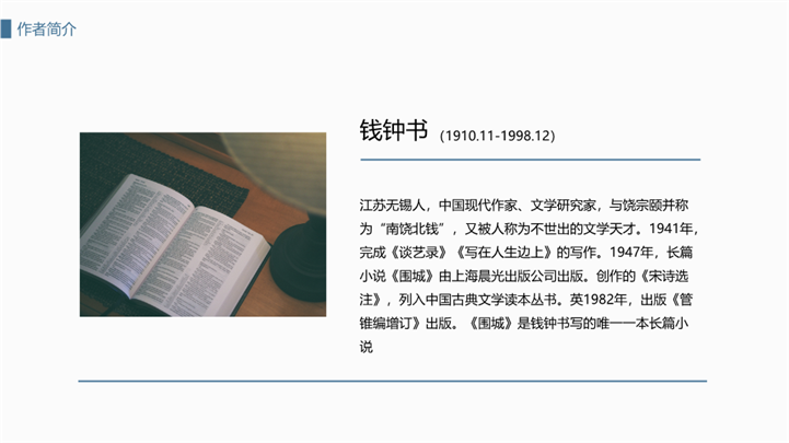 PPT简介: 简洁大方围城国内名著导读ppt模板,蓝色为主色调,整体界面简洁大方风格,主要包含作者简介、主要人物、故事脉络、读书感悟、经典神句等模块内容,适用于读书感悟、名著导读、读书分享会、阅读分享、读书心得、教育培训课件、课程开发、讲师培训、学校教等相关主题设计应用。主体文字及图片可替换修改,文字修改均可直接点击文本框进行编辑,图片更改可选中图片后单击鼠标右键插入更换图片,也可根据自身需求增加和删除。本作品提供PPTX格式文件,转载请注明出处!