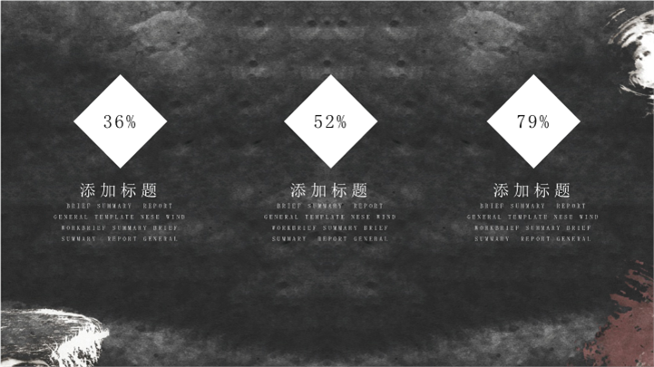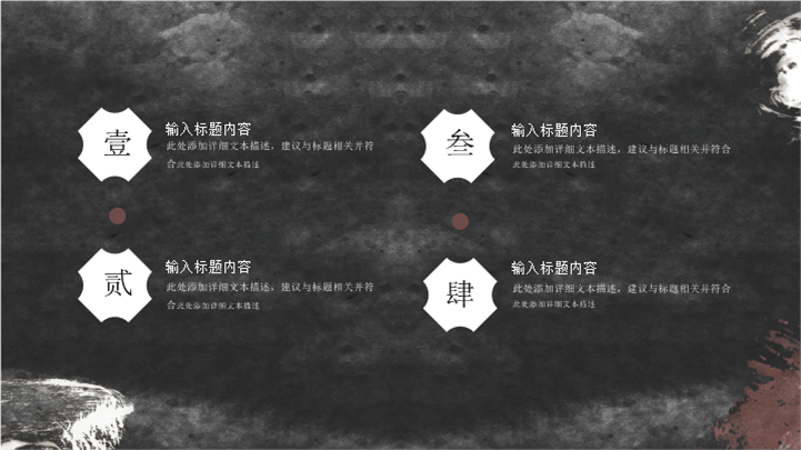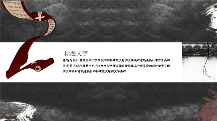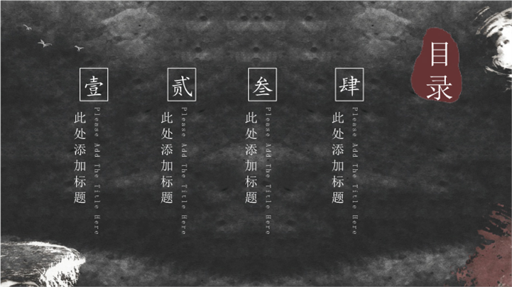 PPT简介: 中国传统水墨画风格工作总结报告ppt模板,深灰色为主色调,整体界面水墨风格,适用于工作复盘、月度总结、月度复盘、计划总结、商务总结、工作总结、总结汇报、商务汇报等相关主题设计应用。主体文字及图片可替换修改,文字修改均可直接点击文本框进行编辑,图片更改可选中图片后单击鼠标右键插入更换图片,也可根据自身需求增加和删除。本作品提供PPTX格式文件,转载请注明出处!
