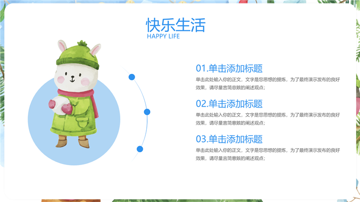 PPT简介: 水彩插画风我的寒假生活记录分享ppt模板,淡蓝色为主色调,整体界面水彩插画风格,主要包含快乐生活、开心学习、愉快玩耍、寒假总结等模块内容,适用于 我的寒假生活、寒假生活、快乐寒假、寒假时光、寒假计划、寒假收获、精彩寒假、儿童成长相册等相关主题设计应用。主体文字及图片可替换修改,文字修改均可直接点击文本框进行编辑,图片更改可选中图片后单击鼠标右键插入更换图片,也可根据自身需求增加和删除。本作品提供PPTX格式文件,转载请注明出处!