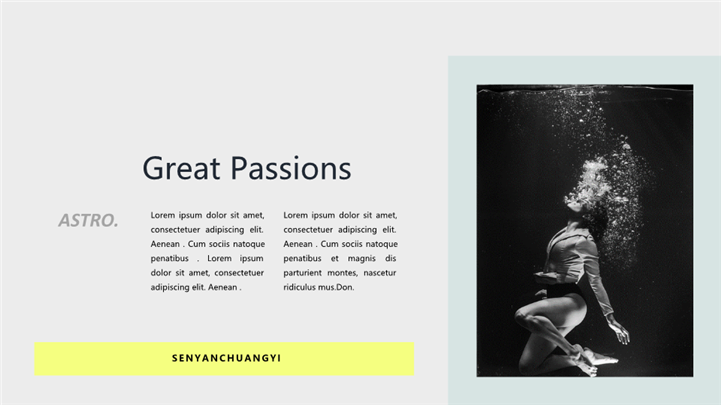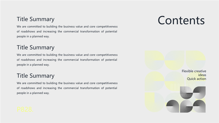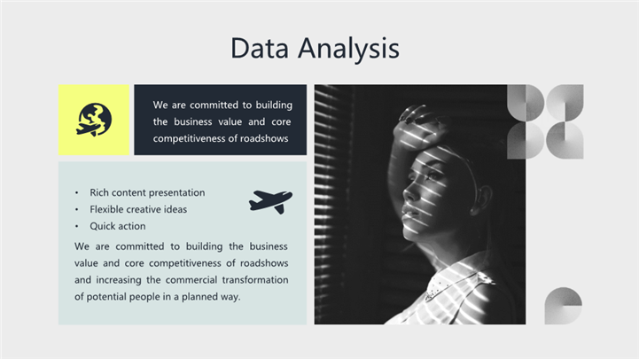PPT简介: 抽象艺术风格企业品牌宣传ppt模板,深灰色为主色调,整体界面极简商务风格,适用于品牌介绍、产品展示、营销策略、产品介绍、产品宣传、产品研发等相关主题设计应用。主体文字及图片可替换修改,文字修改均可直接点击文本框进行编辑,图片更改可选中图片后单击鼠标右键插入更换图片,也可根据自身需求增加和删除。本作品提供PPTX格式文件,转载请注明出处!