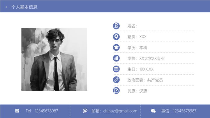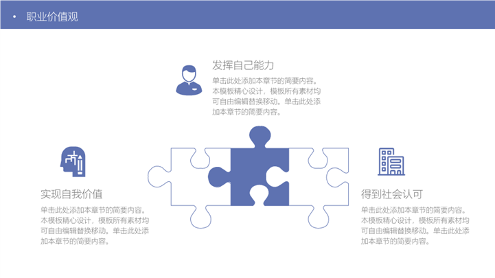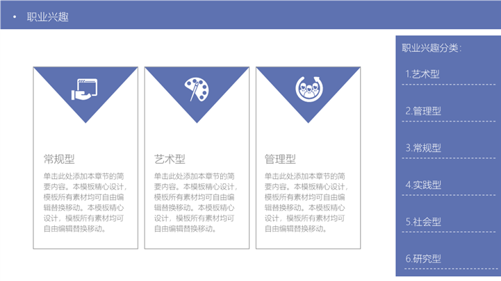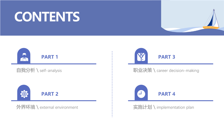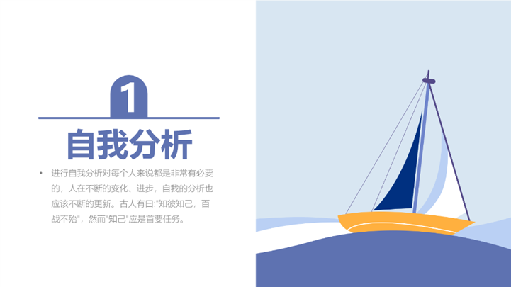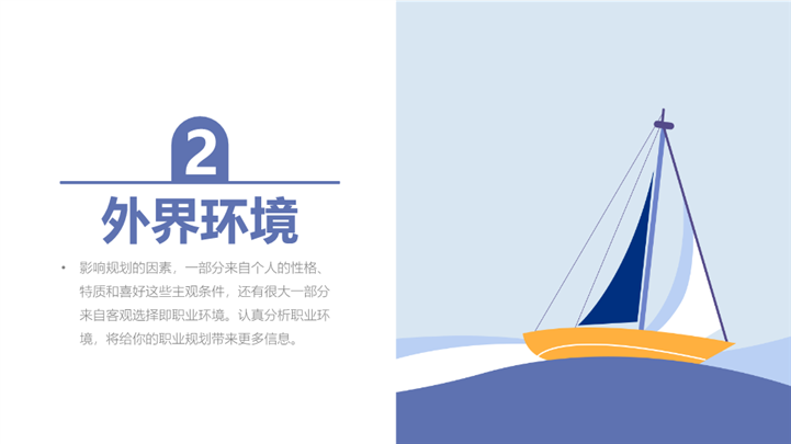 PPT简介: 极简矢量风大学生个人职业规划ppt模板,紫色为主色调,整体界面扁平矢量风格,主要包含自我分析、外界环境、职业决策、实施计划等模块内容,适用于大学生规划、职业规划、职业生涯规划、职业生涯、职业规划培训、个人职业发展规划、职业成长指导、员工培训计划、绩效评估与反馈、职业转型指导、晋升路径规划、员工个人发展计划等相关主题设计应用。主体文字及图片可替换修改,文字修改均可直接点击文本框进行编辑,图片更改可选中图片后单击鼠标右键插入更换图片,也可根据自身需求增加和删除。本作品提供PPTX格式文件,转载请注明出处!