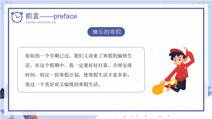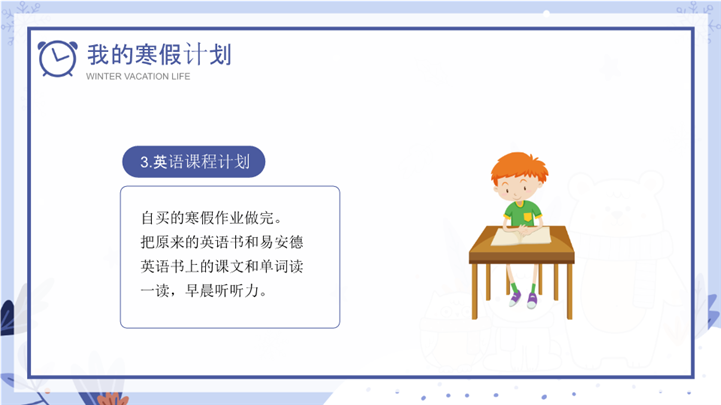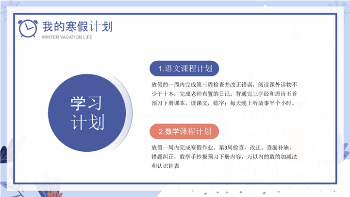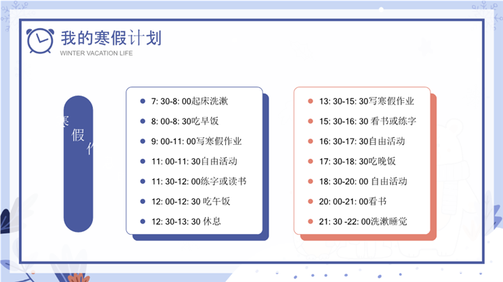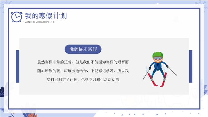 PPT简介: 小学生我的快乐寒假时光ppt模板,淡紫色为主色调,整体界面可爱卡通风格,主要包含我的寒假计划、我的寒假书单、寒假快乐时光、寒假收获与总结等模块内容,适用于我的寒假生活、寒假生活、快乐寒假、寒假时光、寒假计划、寒假收获、精彩寒假、儿童成长相册等相关主题设计应用。主体文字及图片可替换修改,文字修改均可直接点击文本框进行编辑,图片更改可选中图片后单击鼠标右键插入更换图片,也可根据自身需求增加和删除。本作品提供PPTX格式文件,转载请注明出处!