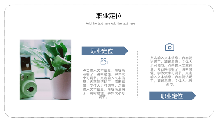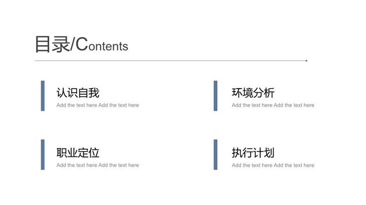 PPT简介: 简约风大学生职业生涯规划通用ppt模板,蓝色为主色调,整体界面极简商务风格,主要包含认识自我、环境分析、职业定位、执行计划等模块内容,适用于大学生规划、职业规划、职业生涯规划、职业生涯、职业规划培训、个人职业发展规划、职业成长指导、员工培训计划、绩效评估与反馈、职业转型指导、晋升路径规划、员工个人发展计划等相关主题设计应用。主体文字及图片可替换修改,文字修改均可直接点击文本框进行编辑,图片更改可选中图片后单击鼠标右键插入更换图片,也可根据自身需求增加和删除。本作品提供PPTX格式文件,转载请注明出处!