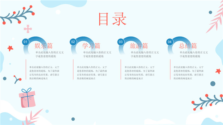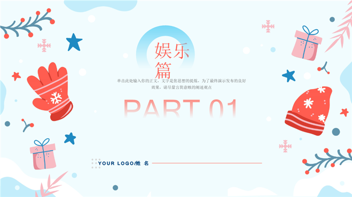 PPT简介: 简约卡通我的寒假生活分享班会ppt模板,浅蓝色为主色调,整体界面卡通简约风格,主要包含娱乐篇、学习篇、旅游篇、总结篇等模块内容,适用于我的寒假生活、寒假生活、快乐寒假、寒假时光、寒假计划、寒假收获、精彩寒假等相关主题设计应用。主体文字及图片可替换修改,文字修改均可直接点击文本框进行编辑,图片更改可选中图片后单击鼠标右键插入更换图片,也可根据自身需求增加和删除。本作品提供PPTX格式文件,转载请注明出处!