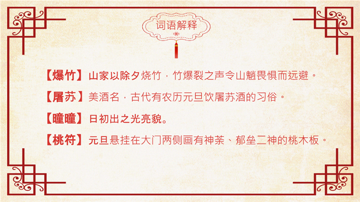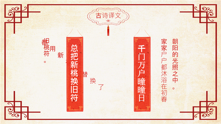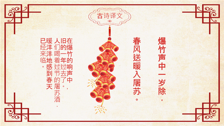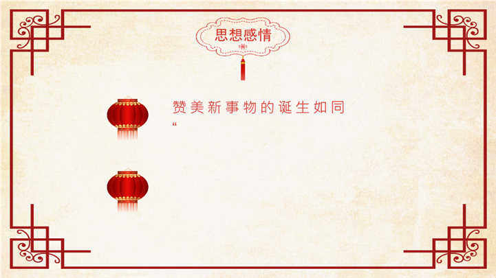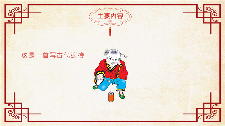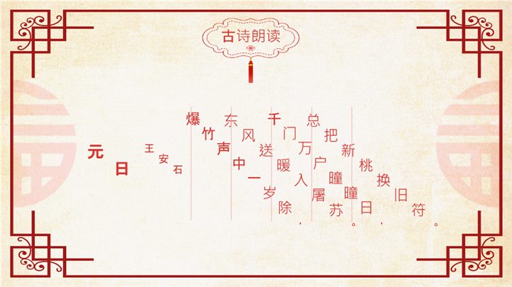 PPT简介: 喜庆红色元日古诗阅读赏析ppt课件,红色为主色调,整体界面喜庆节日风格,适用于工教学分析、教学设计、教学说课、教学方案、公开课、教师公开课、公开课课件、教师工作总结等相关主题设计应用。主体文字及图片可替换修改,文字修改均可直接点击文本框进行编辑,图片更改可选中图片后单击鼠标右键插入更换图片,也可根据自身需求增加和删除。本作品提供PPTX格式文件,转载请注明出处!