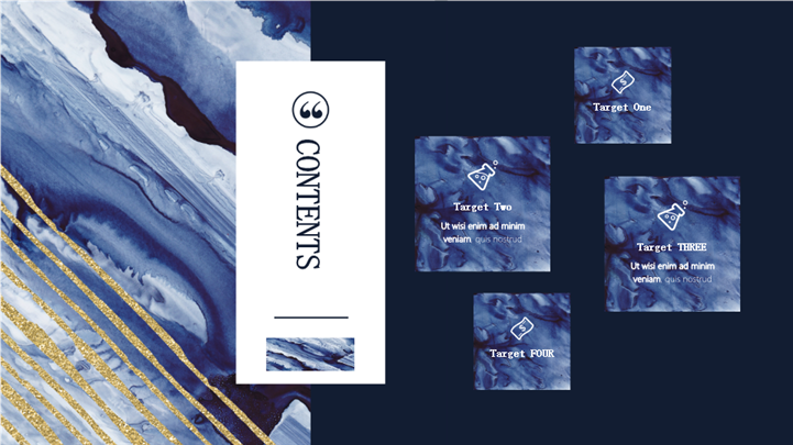 PPT简介: 现代简约蓝调企业文化宣传介绍ppt模板,深蓝色、金色搭配为主,整体界面简约商务风格,适用于企业文化建设、价值观传、企业发展、公司简介、公司介绍、企业介绍、企业宣传、产品介绍、产品宣传等相关主题设计应用。主体文字及图片可替换修改,文字修改均可直接点击文本框进行编辑,图片更改可选中图片后单击鼠标右键插入更换图片,也可根据自身需求增加和删除。本作品提供PPTX格式文件,转载请注明出处!
